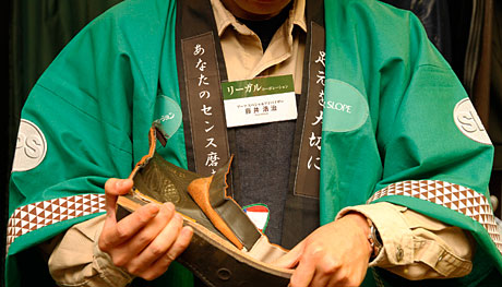 | ペアスロープのR-01/02/05/06/07Cの各ブーツはリーガルコーポレーション製。その可憐なブーツをより深くお伝えするために、同社製作担当の花田氏と藤井氏が出張して皆さまにご案内。 |