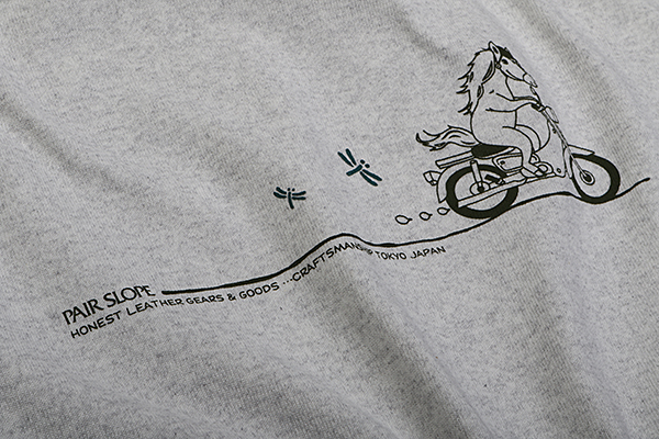 ホースA:バイクに乗って楽する「馬」をトンボが追う。ユルいが、すべて前にしか進めない、前向きな絵。※絵は黒に見えるけれど、茶系と青系の2色シルクプリント。