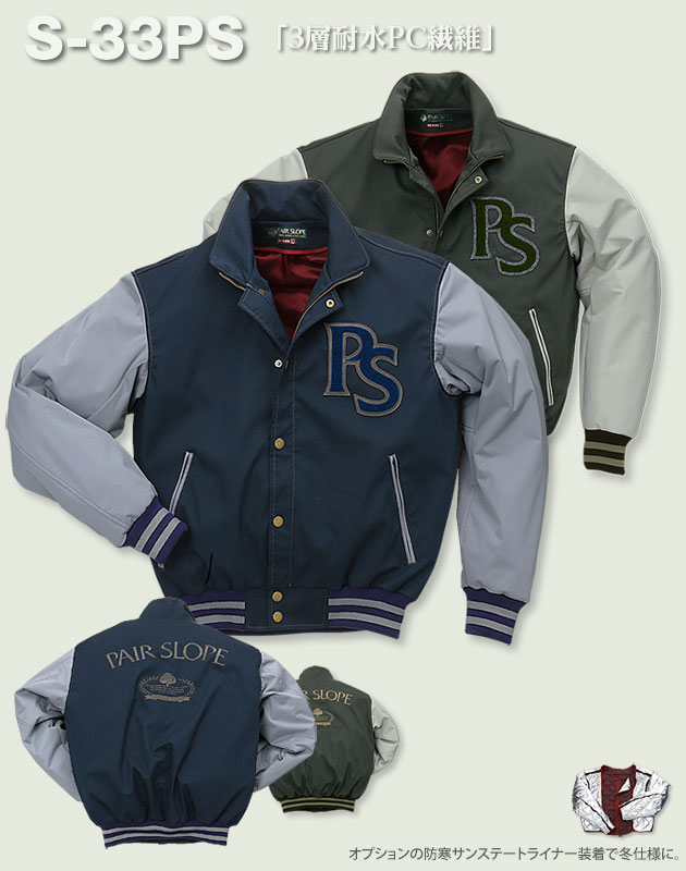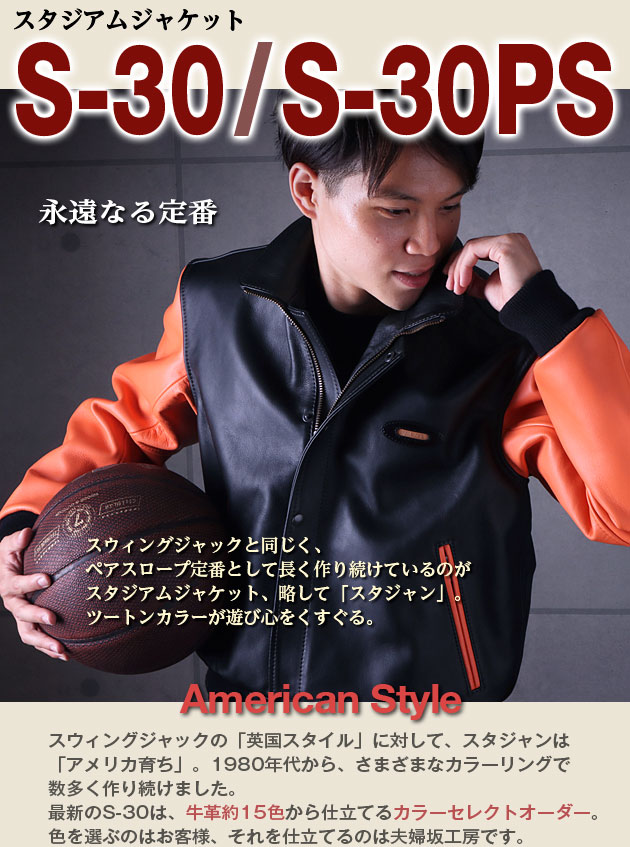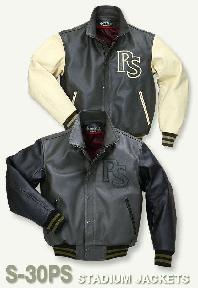 | S-30スタジアムを基本にカスタムしたのが「S-30PS」。2025年より受注生産にて新登場。胸のPS革文字、2本ラインのニットが新鮮。躍動感あるスタジャンです。 |