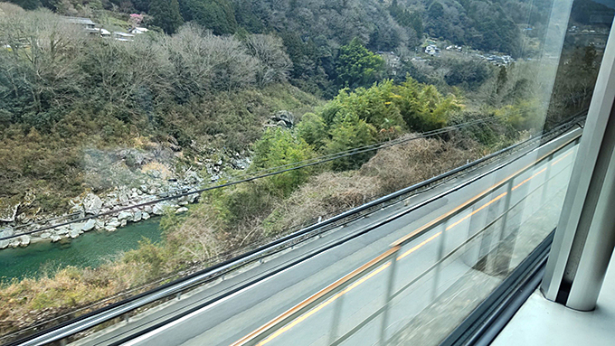 四国の中央付近の山岳線路は、大歩危(おおぼけ)、小歩危(こぼけ)という川沿いの景勝地を通り、そこにはほとんど直線がなく、きびしいカーブばかり。しかし2700系はそんな線形でも100キロ前後で走り続け、すぐ横に並走する国道のクルマを軽~くゴボウ抜き。バイクで並走したら、相当なスピードオーバー(赤紙)を覚悟しなければならんでしょう。