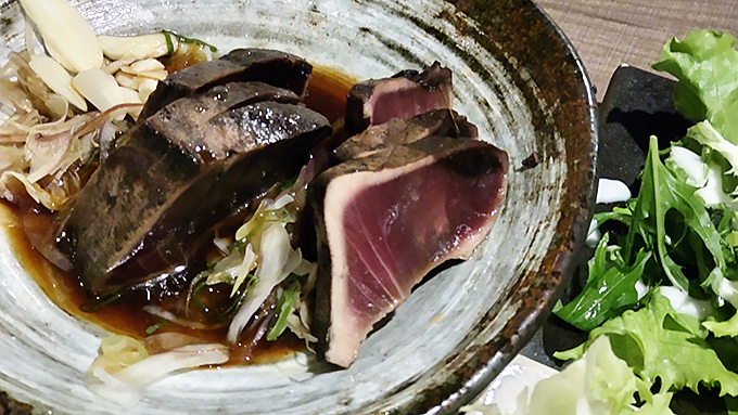 カツオタタキとウツボ唐揚げ&クジラ竜田揚げ&生ビール:約3000円