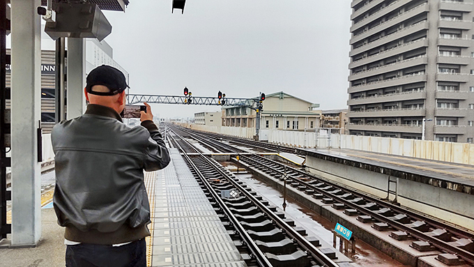 線路の上空に架線がないとスッキリしてますなあ・・・MA-1の革ジャン来てるKさん