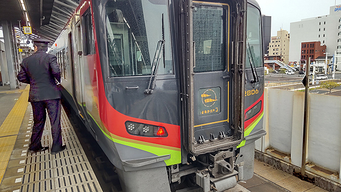この特急の非貫通(前面に連結ドアがないタイプ)の先頭車は超特等席。そして同じく気動車(ディーゼル機関)で、パワーは1両あたり355馬力x2基の710馬力、最高速度130km/h。2700系の900馬力には劣るものの、制御付自然振り子装置の5度傾斜は同じ。