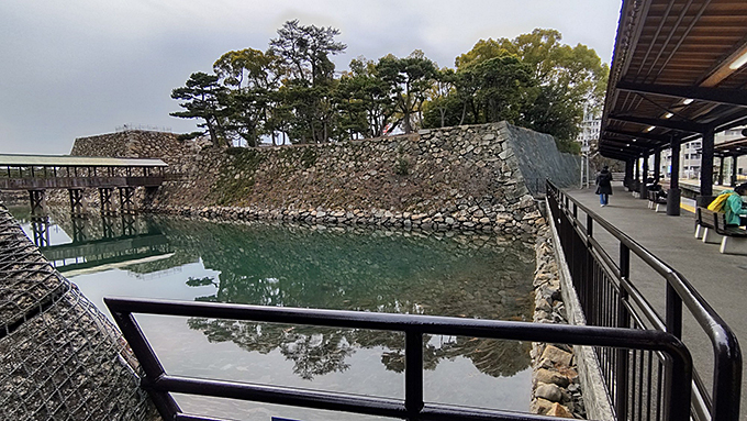 終点の高松築港駅の外壁は高松城の本物の石垣。ホームからはお堀に泳ぐ魚が見える。ん、なんと、フグとかベラとかの海の魚である。