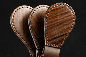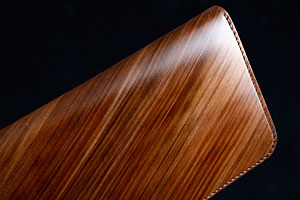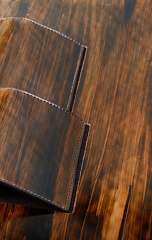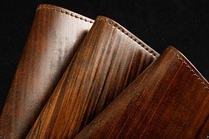 ところで、比較的リーズナブルな牛革ではなく、なぜ高価なコードバンで製作したのかには大きなワケがあった。コードバンでなくては、このような表現ができない・・・と想像して弊社保有のコードバンを石川県に送ったのである。その仕上りは想像を超えていた。 |