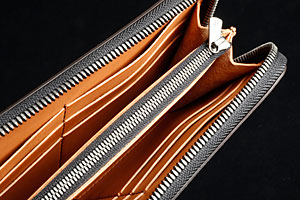 上質なYKKエクセラファスナー。内装は見えない部分まで全て革。 |