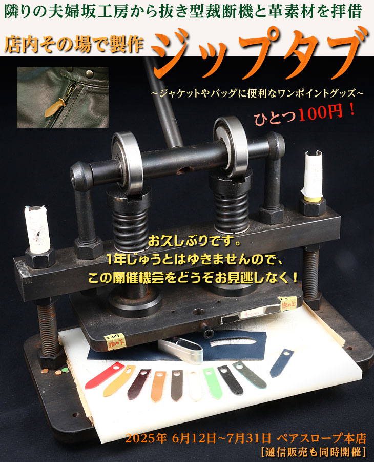 | クロコダイル:牛革をメインにその場で裁断、ですら珍しい作業ですが、こんな希少な革をジップタブにするメーカーなんて聞いたことありません・・・。クロコダイルのみ税込300円、それでもビックリ価格なのです。 |