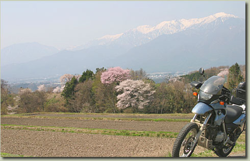 4月12日、中央高速を信州目指して走る。当然ながら、高速走行の苦手なオフ車ジェベルに私が乗る。流れの速い(120km/h以上)追い越し車線は走れないし、尻は痛くなってくるし、で苦痛だけれど、カミさんがジェベルに乗ったらドン臭いので仕方がない。 高回転のエンジン音を聞きながら、満開の桜を思い浮かべて口ずさむ。“ぼく〜が そぉ〜ばにいるぅ〜よ♪” 河口恭吾の「桜」だ。昨年のこの時期は森山直太朗の「さくら」だったし、一昨年は福山雅治の「桜坂」だった。しかし、童謡の「さくら」は口ずさんだことはない。“さぁ〜くぅ〜らぁ〜、さぁ〜くぅ〜らぁ〜♪”って、暗すぎだね。そのあとの日本語もよく分かんないし。あれじゃぁ、ブレーキングが遅れてガードレールに突っ込んじゃう。 |