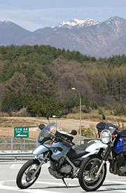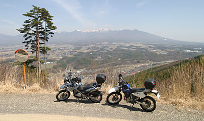 | 最近、夫婦でのツーリングが多い。その理由はカミさんが大型自動二輪の免許を取得したことにほかならないが、今回の桜ツーリングのように、仕事よりも桜の満開優先で、しかも平日の1泊ツーリングとなれば、そう簡単に同行する仲間はいない。「明日、信州に行くぞ」ってついて来るのはカミさんくらいだからだ。 今回のバイクはBMW F650とスズキ ジェベル250。オフ車もどきとオフ車の組み合わせだが、モンゴルツーリングのツアーに行きたいためのダート練習も兼ねている。そのモンゴルは私が行きたいと言ったわけではなく、アウトライダー誌(Vol. 4)に影響されたカミさんの希望。そのナラシ運転といったところか。(でも、いつ行けるかは未定) |