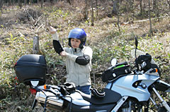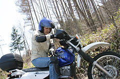 | ヒジ・ヒザにプロテクションガードを着け(ほんとは身体に装着するもの)、東京から乗ってきたF650に跨ろうとするが、ちょっと待ったぁ! 20年ぶりのダートで、重いF650を操れるわけがなく、ジェベルに乗り換えさせる。 |