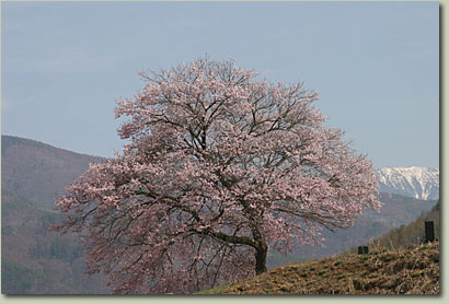 | 勝間のシザレザクラから南に目を向けると、後方に南アルプスを従えて、丘の上にポツンと咲いている。名のある桜ではないのだろうが、なんとも心を引かれる。 |
