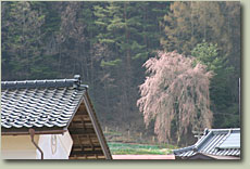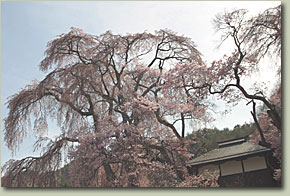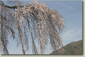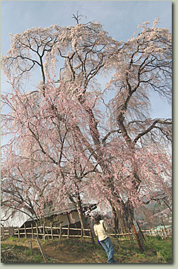 | 勝間のシダレザクラ:4月12日現在では、7分咲きといったところか。満開ならさぞかし可憐なことだろうが、それでも十分に美しい。樹齢は140年と少々。 | ||||