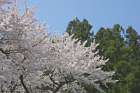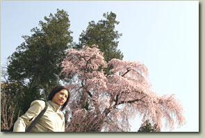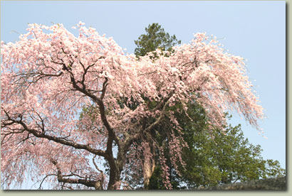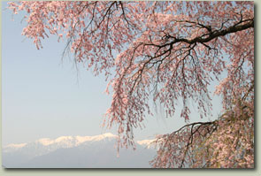 樹齢400年といわれるこのシダレザクラ、薄紅色の花をいっぱいに付けた堂々たる姿と、遠く残雪の中央アルプスとのコントラストが実に美しい。