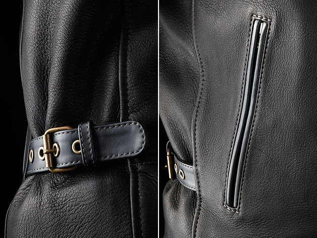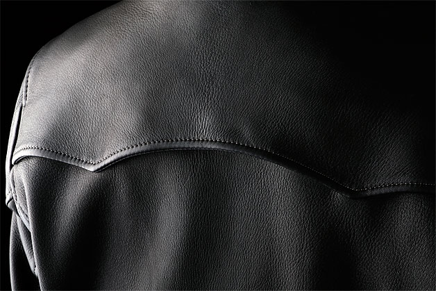 | 背中の特徴的なパラソルテール。弊社STP系等、ブリティッシュスタイルのジャケットに多い伝統的なディティールを、遊び心で取り入れました。無骨に見られがちなダブルライダースですが、洗練された洒落っ気のある印象になっています。牛革とは異なるシボ(革の模様)を持つ鹿革の表情も上質感を演出。鹿革ならではの柔らかい着心地としっとりとした肌触りが、所有欲を満たします。 |
