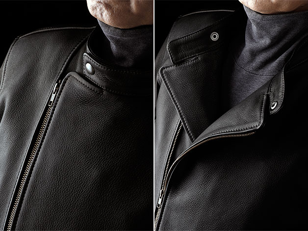| 襟を閉じれば引き締まったシックな印象、開けばリラックスした雰囲気に。スカーフなどを合わせるのも洒落ています。良くある装飾パーツは廃していますが、ライダースらしい存在感を残すため、ファスナーを完全に隠さず、中央部が見えるように仕立てています。シンプルに見えて複雑なパーツの合わせや、正確な縫製が「良いもの」であることを主張します。また、光沢の少ない鹿革がひときわ上品に見せます。 |