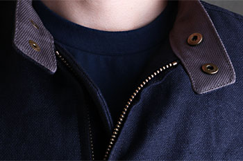 | ヘルメットと干渉しにくいドッグイヤータイプの襟。首周りはやや余裕があり、閉じても窮屈さを感じにくい作り。リラックスして着こなせます。 |