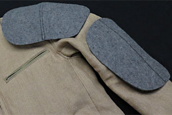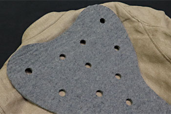 肩・肘には内装固定式のフエルトパッド。良くある樹脂製の物よりもはるかに引き裂きや摩擦に強い上、劣化の心配がありません。