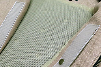 両胸に胸部プロテクター取付用のマジックテープを標準装備。ここは耐衝撃のため、フエルトではなくHYOD社製のD3Oプロテクターをオプションでご用意。一緒にお求めいただけます。