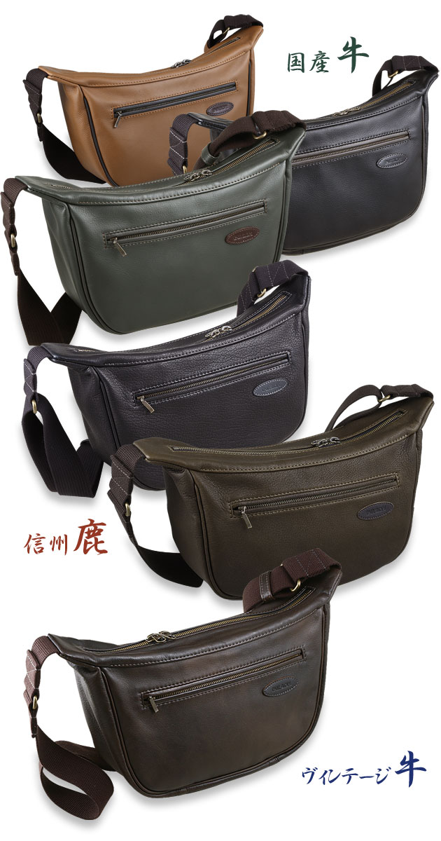 革素材を変更した上級グレードも用意。ヴィンテージ牛は手作業で染色の濃淡をつけた革の表情が高級感を高めており、信州産の鹿革は柔らかくて手触りが素晴らしく、1個作るのに1頭分の革を使う贅沢な作り。いずれも革がある時のみ受注可能です。製作にお時間をいただく場合があります。