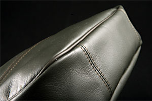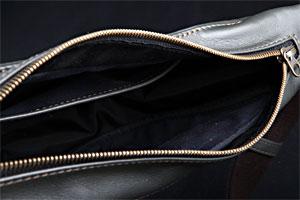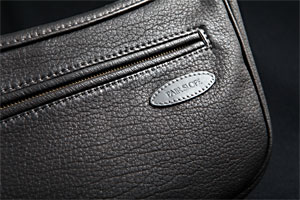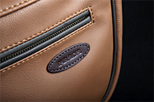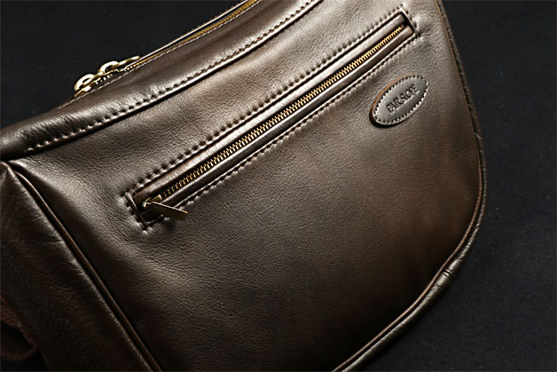 向かって右側のブランドネームは、革の王様コードバン。ひとつひとつ手動プレスで裁断し、手作業で焼印しています。外部ファスナーポケットと共に一糸乱れぬ正確な縫製が「良いもの感」を引き立てます。
